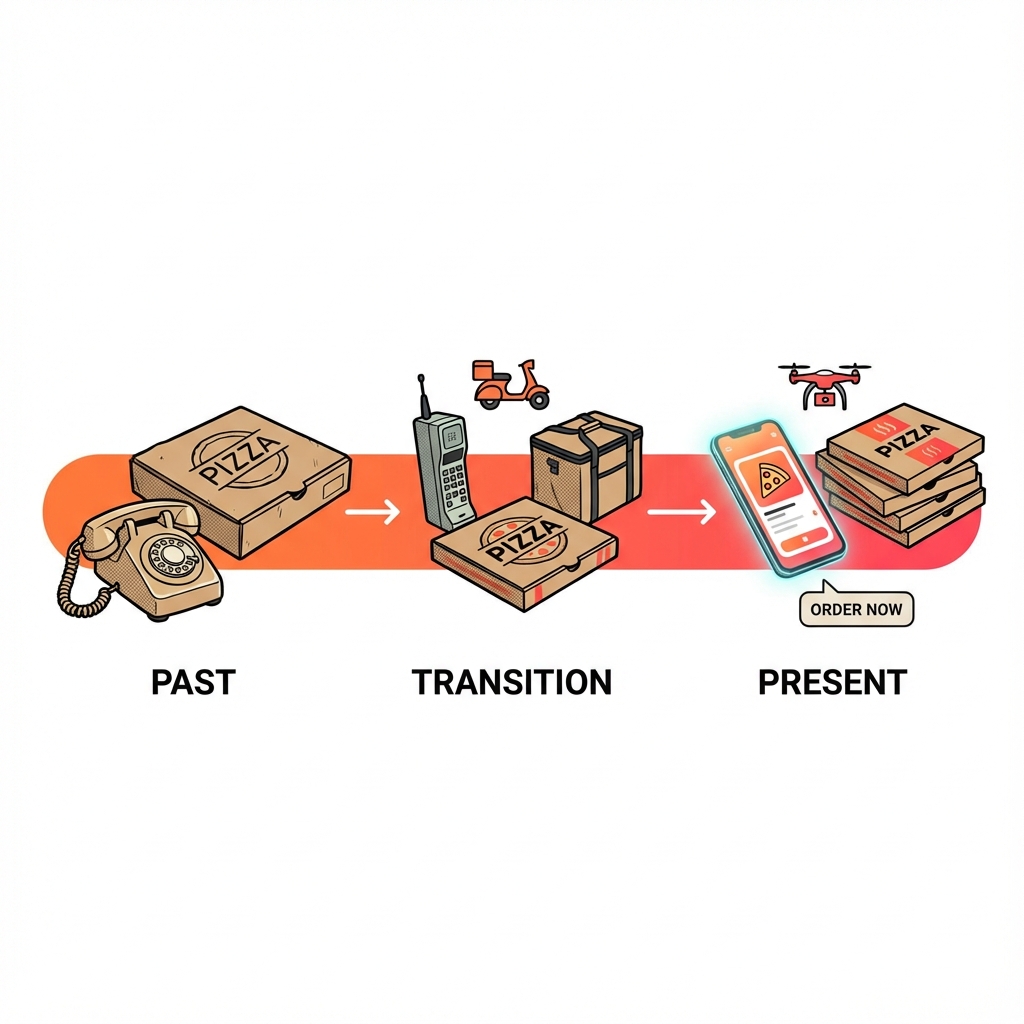 Jak to się zaczęło? Kiedyś trzeba było mieć ulotkę i telefon stacjonarny. Dziś wystarczy kliknięcie w zegarek. Zobacz ewolucję rynku food delivery.